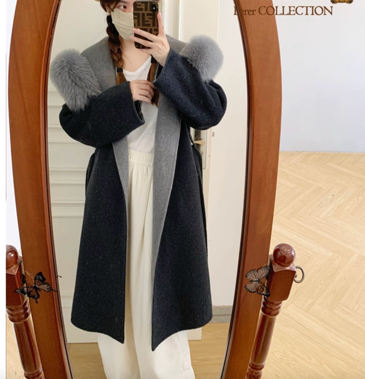 配色カラー ウール70% フォックスファー フード付き ロング丈 ウールコート アウター バイカラー