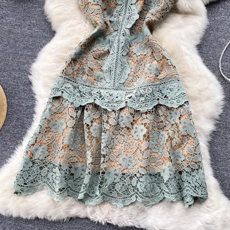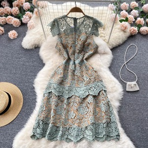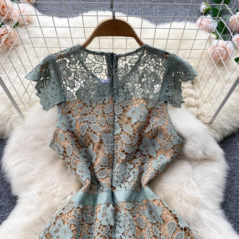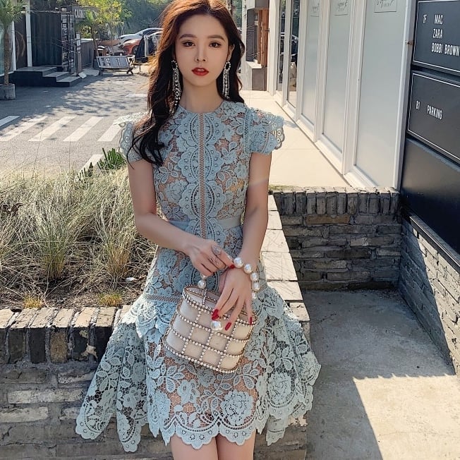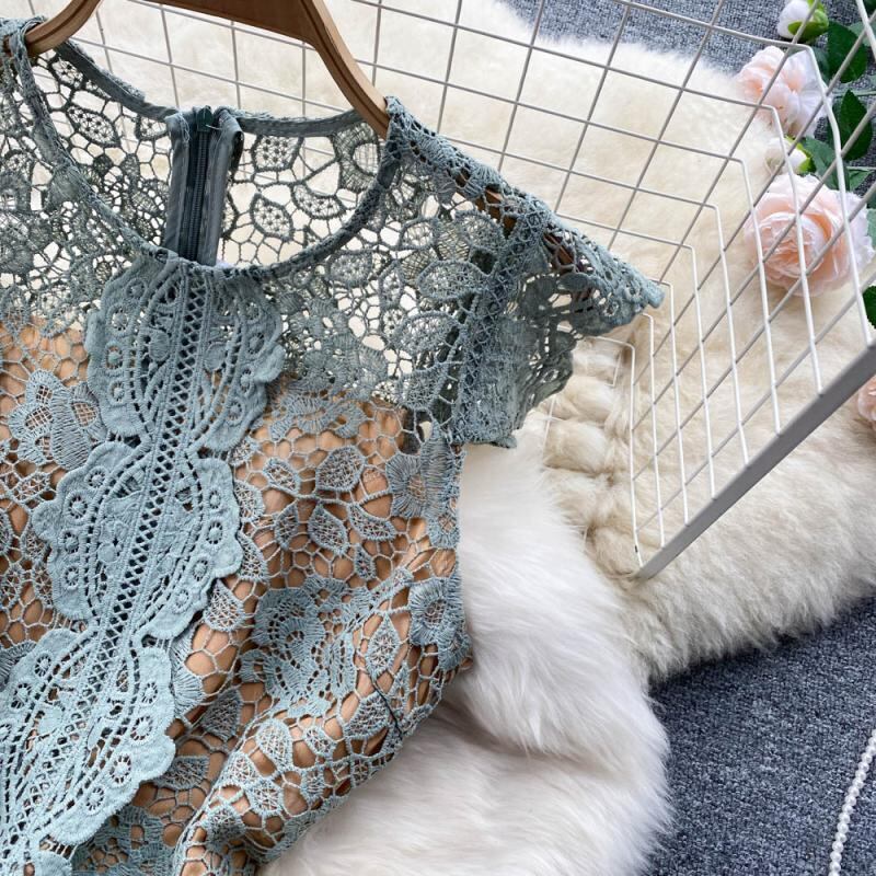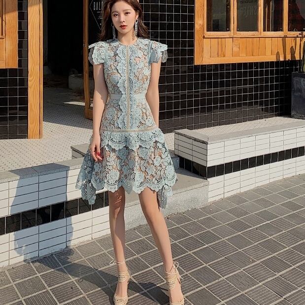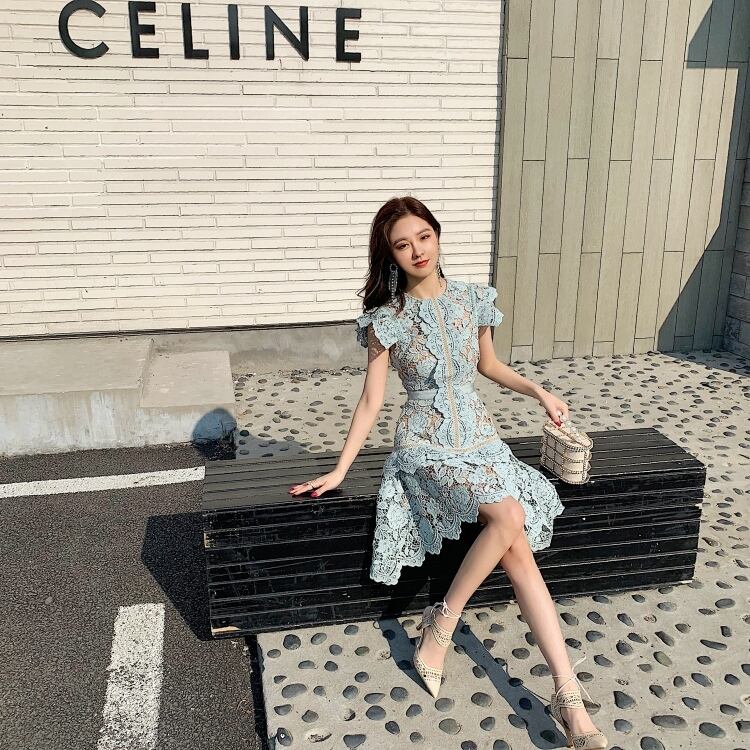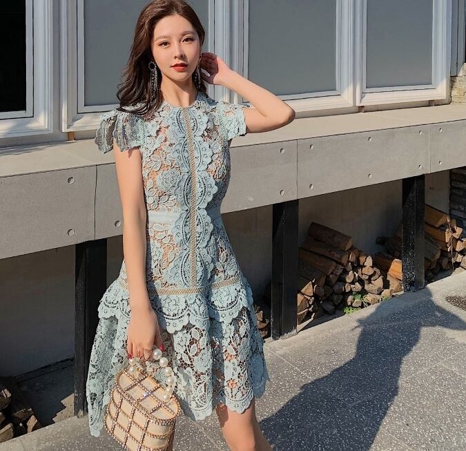 ■総レース ノースリーブドレス フリル 膝丈 ミディ丈 キャバドレス 水色 パーティードレス 韓国 結婚式 二次会